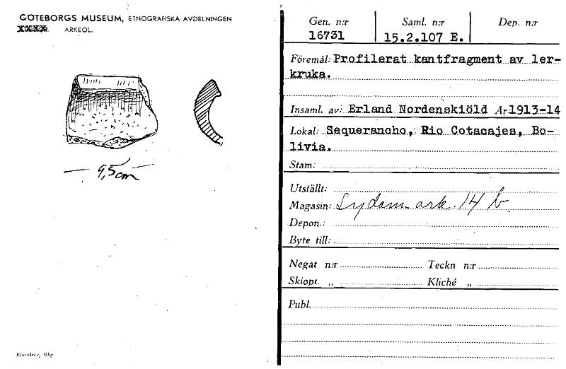 • GOTEBORGS MUSEUM, ETNOGRAFISKA AVDELNINGEN XraNgt. ARKEOL. Gen. n:r . • 16731 Saml. n:r 15.2.107 E. Dep. n:r Föremål: Pro.filerat...kantfragment...av....lerT kruka. Insaml. av.'..Erland...Nordenakikad... Visa hela