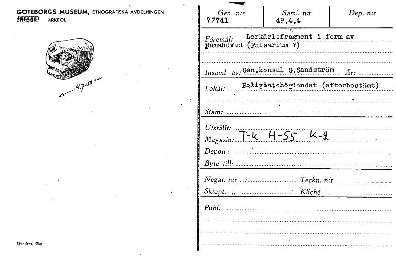 • GOTEBORGS MUSEUM, ETNOGRAFISKA AVDELNINGEN gil~ ARKEOL. Samt. n:r Gen. n:r Dep. n:r 77741 49.4.4 Föremål: Lerkårlsfragment i form av pumahurad (Falsarium ?) Insaml. av: Genkonsul G. Sand ström Är: L... Visa hela