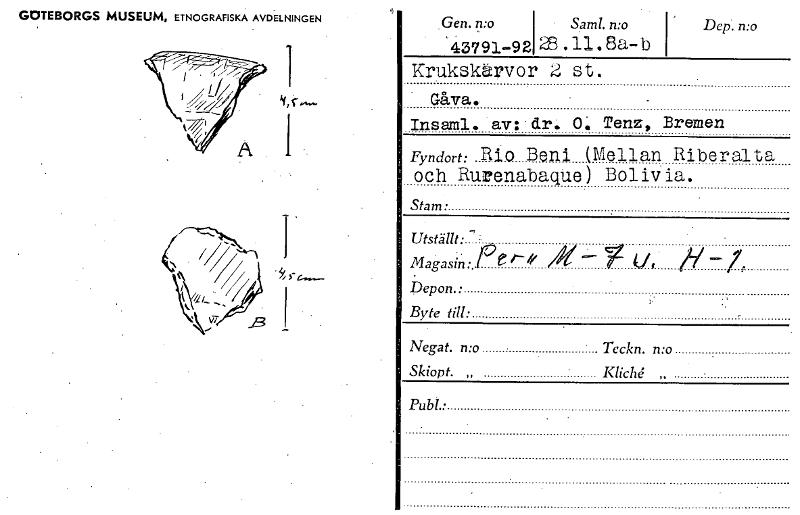 • GOTEBORGS MUSEUM, ETNOGRAFISKA AVDELNINGEN Gen. mo Saml. n:o Dep. n:o 43791-9228 .11. 8a.-b Krukskärvor 2, st. Gåva. Insaml. av: dr. 0: Tenz, Bremen Fyndort: R10 Beni (Mellan Riberal ta och Rurenabaq... Visa hela