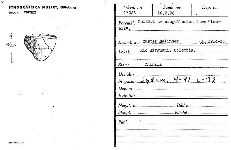 • _ - -Gen. n:r 17026 . . . • Saffil. n:r 16.3.3.6 • Dep. n:r ETNOGIiitFISKA MUSEET, Göteborg ETNOGR. ~ÖM Föremål: bli". Lerkärl av oregelbunden form nlomm- Insaml. av: Gustaf Bolinder Är: 1914-15 Lo... Visa hela