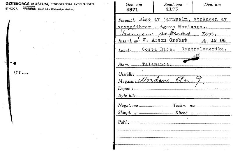 GOTEBORGS MUSEUM, ETNOGRAFISKA AVDELNINGEN ETNOGR. nukiga. (Det icke tillämpliga strykes) Gen. n:o 4871 Saml. n:o 2.17 3 Dep. n:o Föremål: Båge av järnpalm, strängen agavefibrer - åga,ve äeJd-Qana.- av JA," -ka er— t Insaml. av: Lokal: 4,492—£,L.G.K.-4-4.. Köpt. W. A:son Grebst Ar: 19 06 Costa Rica. Cehtralamerika. 17 Stam: Talamanca. Utställt: Magasin: Depon.: Byte till: Negat. n:o Teckn. n:o Skiopt. „ KlicU „ Publ.: [ocr]