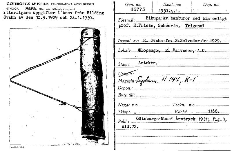 GOTEBORGS MUSEUM, ETNOGRAFISKA AVDELNINGEN F.TNOGR. Xjagik. (Det icke tillämpliga strykes) Ytterligare uppgifter. i-brev från Hilding Svahn av den 30.9.1929 och 24.1.1930• Gbg ' Gen. n:o 457" .." p . Saml..n:o 1930.4.1. Dep. n:o ' Föremål: . Bikupa'. av. bamburör med bin- enligt , prof. H.FYise., Schwerin, Ti. j.fiona? insa rrz /. a v : .. H....Svahn::fr:i...S.Salvador Ar :-.1929. P Lokal: alopangol, Stam: Azteker.. r Ej. .5alvadory--A.C. . ›ttl5.;-- , Magasin: 1-/-6'11 /(-1 • Depon. • . j Byte till: . ' Negat. n:o Skiopt. „ Teckn. n:o Klielid• „ 1166. z Publ.: ' sida2. Göteborgs7-Musei...Årstryck -1931, fig • 3, [ocr]