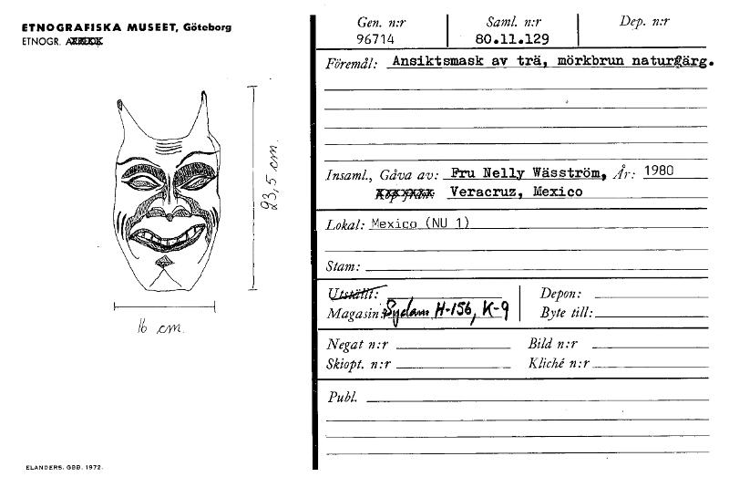 ETNOGRAFISKA MUSEET, Göteborg ETNOGR. AIZEZIR C3-2 16 ,cyn ELANDERS. GBB. 1972. Gen. n:r 96714 Sand. n:r 1 80.11.129 Dep. n:r I Föremdl• Ansiktsmask av trä, mörkbrun naturgärg , Insaml, Gåva av: Fru Nelly Wäsström, iir• 1980 Kfgemin Veracruz, Mexico Lokal- Mexico (NU 1) Stam• IDepon• I Byte till: Magasinklig~ fl-MIK-9 Negat n:r Bild n:r Käckt n:r Skiopt. n•r Publ. [ocr]