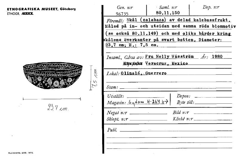 ETNOGRAFISKA MUSEET, Göteborg ETNOGR. ATEXOCX. — ;•,1- Viltivre.1 wueuut, tAik-oliliki Uti 92,785‘" Ifk) g 'S■C -P- • ----Ität9,40,6,./ 1/3 ELANDERS, GBB. 1972. Gen. n:r 96735 i • Saml. n:r 80-.11,150 Dep. n:r I Föremål.' Skål (calabazu) av delad kalebassfrukt. Målad På in— och utsidan med samma röda blommoti se också 80.11.149 och med olika bårder krill, 3kålens överkanter på svart botten. Diameter: 23,7 cm; H,: 7,5 cm. Insaml., Gåva av: Fru Nelly Wäs ström År: 1980 laptforAm Veracruz, Mexico Lokal: Olinalä,.Guerrero Stam: Utställt: Depon• i Byte till: Magasin- -. am 14- 2-4'1 Ir? lel Negat n:r Bild n:r Kliché n:r Skiopt. n:r Publ. [ocr]
