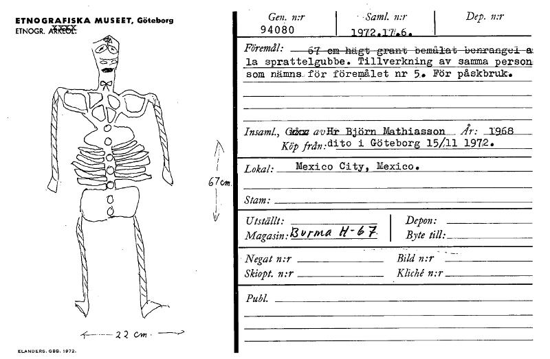 • ETNOGRAFISKA MUSEET, Göteborg ETNOG R. AURS ti\ 67c44. +-----2 2 CAn • ---" ELANDEMGE03.1972. Gen. MT 94080 i —Sam/. 11.T I 1972.174.6.i Dep. MT Föremål: 67 hägt bemålat benrangel cm grant a la sprat... Visa hela