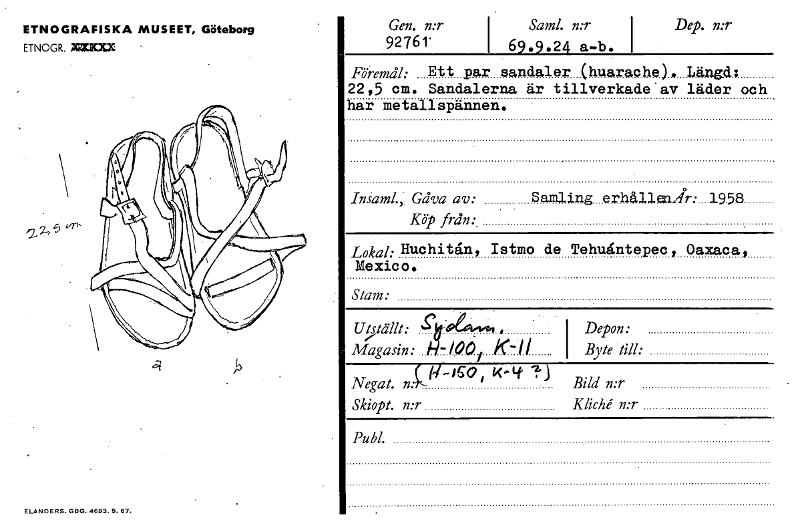 Gen. n:r 92761' Saml. n:r I Dep. n:r i 69.9.24 a-b. I ETNOGRAFISKA MUSEET, Göteborg ETNOGR. =DOM • )6 Före mm Ett par sandaler (huaraohe). bängd; 22,5 cm. Sandalerna är tillverkade 'av läder och har metallspannen. Gåva av: Samling...erhålla-Jr: 19.58 Köp från:_ Lokal: Huchitåny Istmo de Tehuåntepecy Oaxacal Mexico. Stam: Utrställt: 4-Peovvri , I Depon: ' Magasin: .9.7.toot K-11 I Byte till: ( 14-49 2i K-Lf 3. ) Negat. n:)6.. 'Bild n:r Skiopt. n:r Kliche. n:r Publ. ELANDERS. GBG. 4693. 5.67. [ocr]Stäng
