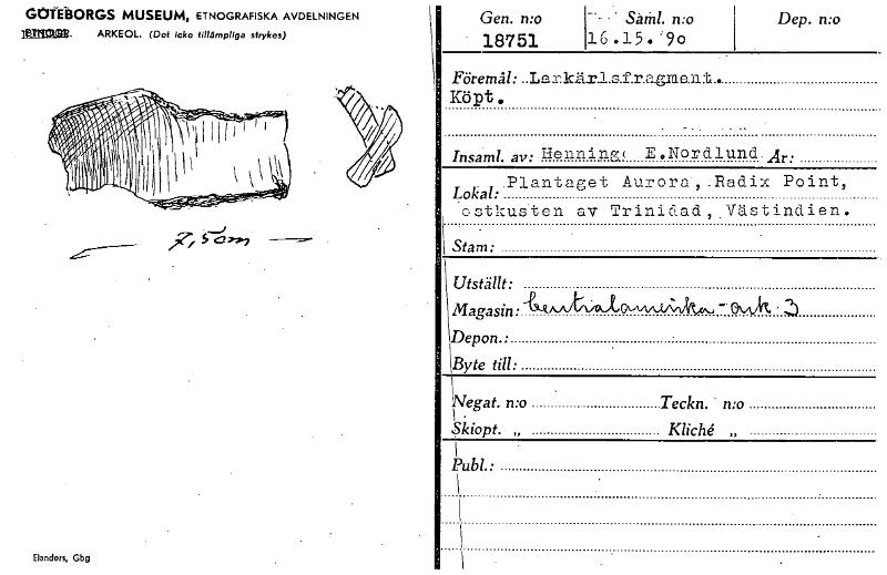 GeKE-BORGS MUSEUM, ETNOGRAFISKA AVDELNINGEN 1~2 ARKEOL. (Det icke tillämpliga strykes) - Elanders, Gbg Gen. mo . 18751 - • . Sathl. n:o 16.15'. '90 Dep. n:o Föremål: ..Lerlkii.r.l.s.f.r.a.g.ro.e.n.t.. Köpt. Insaml. av: -Hennin.g ( • E.Nordlund. Ar: Lokal:.Plantaget Aurora', .Radix Point, . ' ostkusten av Trinidad , :Västindien. Stam: Utställt: Magasin:14-A-At‘>01,01/4-^-4-A-R;AU-, •Ovvk . \ Depon.• \Byte till: \Negat. n:o • Teckn. n:o I • .5kiopt. „ Kliché „ I Publ.: \ \ . • [ocr]