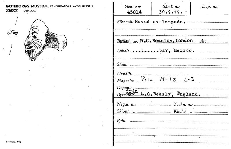 GOTEBORGS MUSEUM, ETNOGRAFISKA AVDELNINGEN etwou. ARKEOL, Gen. n:r Saint. n:r Dep. n:r 45814 30.7.17. 07497 Föremål: Huvud av lergods . Bel. av: 1.C:13easleyelkondon.... År: Lokal:. • . , co Stam. Uts...