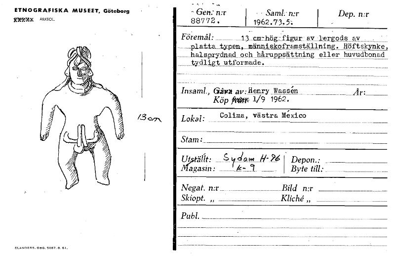 ETNOGRAFISKA MUSEET, Göteborg rontx ARKEOL. ELANDERS. GSG. 5687. B. 61. - Gen: n:r 88772 , i , • Samt.- n:r i 1962..7'3,5; I Dep. n:r I - .- Föremål: 13 cwhög:figur.av-lergoda p3.attaty_pan„människoframställning. halaprydnad och håruppsättning tydligt utformade. Insard, aini av:Henry Wassen KipftWYK 1/9 1962. av . . - Höftskynke, eller huvudbonad Ar: Lokal: Colima, västra Mexico Stam: Uytälit: ii.dow M _Ii- Byte till: Depon.: Magasin: ' /e- cl Negat. n:r_ Bild n:r Skiopt. „ KlicH „ Publ. /30.„7\ [ocr]