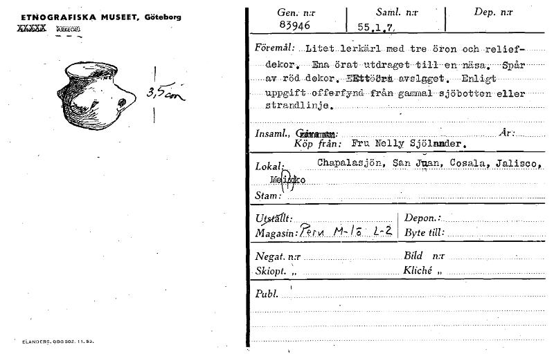 ETNOGRAFISKA MUSEET, Göteborg MrukW Gen; n:r 83946 ISam!. n:r i 55.1.7, Dep. n:r Föremål: ,, tre-öron. •och•reiief- dekor, Ena örat utdraget -till -en näsa. Spår av röd-dekor. EllIttötrivavslgget. Enlig uppgift offerfynd-från•g,ammal- sjö-botten eller strandlinje. Insaml., Crima" Köp från: Fru Nelly Sjölander, 3, Lokal: Chapalasjön, San (Nan, Cosala, Jalisco, Stam: Utställt: Magasin: r vt 1 ö • L- Depon.: Byte till: Negat. n:r Bild n:r ,Skiopt. ‘„ „ Publ. I ELANDERS. DAG 502. 1.53. [ocr]