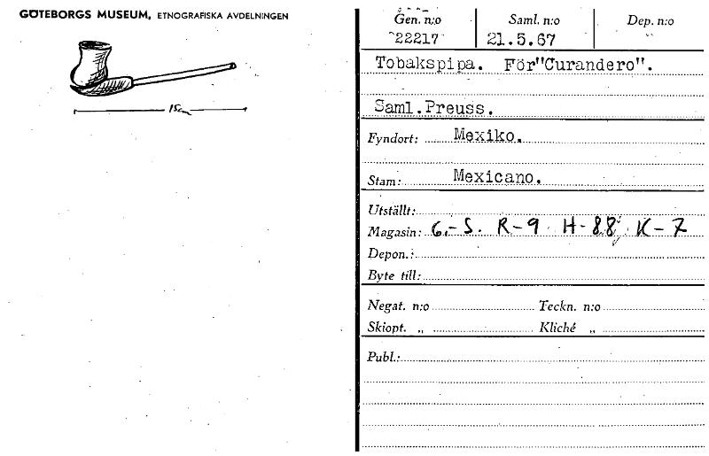 • GOTEBORGS MUSEUM, ETNOGRAFISKA AVDELNINGEN Gen. Samt. n:o 1. Dep. n:o 22217 21.5.67 - Tobakspipa. För"Curandero". jaml.Preuss. Fyndort: Mexiko. Stam • Mexicano. Utställt: Magasin: C I.- K.-7 14 Depo... Visa hela