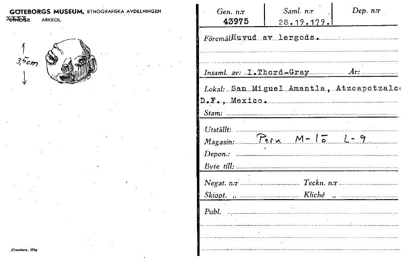 • Dep. n:r GOTEBORGS MUSEUM, ETNOGRAFISKA AVDELNINGEN 744615R. ARKEOL Gen. n:r Samt. n:r 43975 28.19.179. Insaml. av: ..I..Thord,,Gray År: Stam: Utställt: Magasin: M 17 171 Depon.• Byte till: Negat. n:... Visa hela