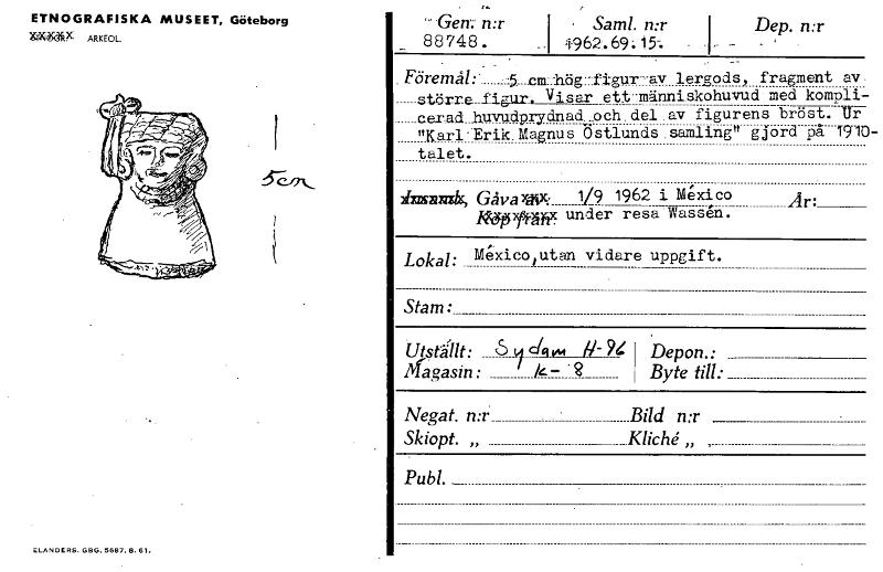 ETNOGRAFISKA MUSEET, Göteborg X4442Pc ARKEOL ELANDERS, ABS. 5687.8. 61. te. - Gem n:r 8 8 748 . Sm n Dep n:r •1 1.962a. 691. i5:...r .I, _ _ . . • - . Föremål: -5_cm-I1ög:fIgur-av lergods, fragment a.kr större figur Visar ettTmänniskohuvud med kompli- "Karl'Erik.Magnus talet. 2113571727.1; Gåva 41PC: iwypw cerad buvadprydnad_och.del.av figurens bröst. Ur Östlunds.samling4 gjord på 191C 1(9 1962 i Mexico Är: under resa Wassgn. Lokal: Mexico,utan vidare uppgift. Stam: Utställt: 6 4 cfq im il- 7t Depon.: Byte till: gagasin: ' k — . 2 Negat. n:r Skiopt. „ Bild n:r Kliché. „ , Pub!. [ocr]