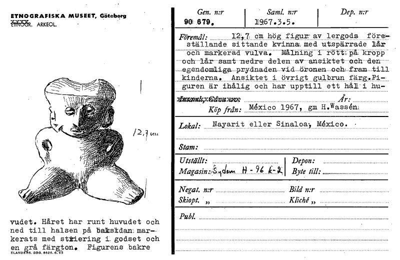 ETNOGRAFISKA MUSEET, Göteborg 199.63.R. ARKEOL. vadet. Håret har runt huvudet och ned till halsen på berrskdani mar- kerats med stiriering i godset och en grå färgton. Figurens bakre Gen. n:r 9a.679 I ' Saml. n:r I 1967.3.5. Dej'. n:r i Föremål: I2-,7, Cm hög figur av lergods före= ställande sittande kvinna med utspärrade lår och markerad vulva. Målning i rot-L på kropp ....o-ch-lår-samt-medre-delen-av-ansiktet-o.ch-den egeradonuliga..prydnaden,..vid...äronen...och_fram..till kinderna. Ansiktet i övrigt gulbrun färg.Fi-. guren är ihålig och har upptill ett hål.i hu- xTmenx4x4Wurraw iir: Köp från: M4xico 19679 gm H.Wasskil Lokal: Nayarit eller Sinaloa5 M6xico. - Stam: Utställt: - Magasin:I:4cl~ H - 9g k- ,9 Depon: I Byte till: Negat. n:r Bild n:r Skiopt. „ Kliché,, Publ. [ocr]Stäng