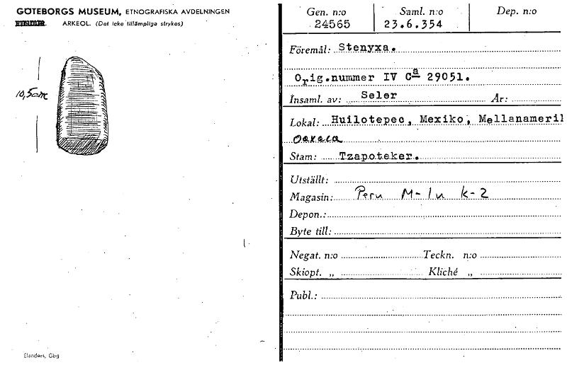 GOTEBORGS MUSEUM, ETNOGRAFISKA AVDELNINGEN 3~1. ARKEOL. (Det icke tillämpliga strykas) Elanders, Gbg , Gen. n:o - 24565 Sam!. no 23.6.354 Dep. n:o Föremål: Stenyxa. Orig *nummer IV C1 29051. Insaml. ...