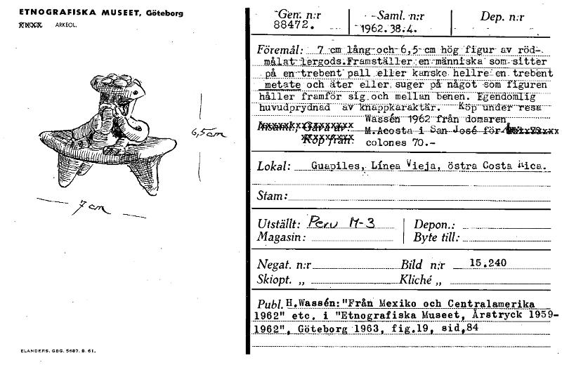 ETNOGRAFISKA MUSEET, Göteborg Dexx ARKEOL ELANDERS, GBG. 5687. B. 61. Gen: n:r 88472. _ • -Sam!. :r I -1962.38:4: Dep. n:r I _ Föremål: 7 -cm lån-g-och-6,5-cm hög -.figur- av röd:- mål at-ler_gods :Fram ställer:. en:människa söm- -sitter _ på en-trebent- pall .:eIler kanske. hellrei en . trebent - .metate och äter eller suger på något -som figuren håller framför sig och mellan benen. Egendomlig huvudprydnad av knappkaraktär. Up-uh-der r-esa----- Wassen 1962 -från- -darriar-en ijfirs#F415Pgål5ä4Y139( M.-A-ecetf-±-1---San-Jos-e---förAkik~ ftic-6/53rfrffif colones 70.- Lokal: GuapiiesL Linea. Vida, östra Costa hica. Stam: Utställt: ____t_t) «-,3 Byte till: Depon.: Magasin: Negat. wr Bild n:r Kliché,, 15.240 Skiopt. „ Publ. H.Wass4n:"Från Mexiko och Centralamerika 1962" etc. i "Etnografiska Museet, Årstryck 195!: 1962"_._ Göteborg_•1963, fig.19, sid..84 -- [ocr]
