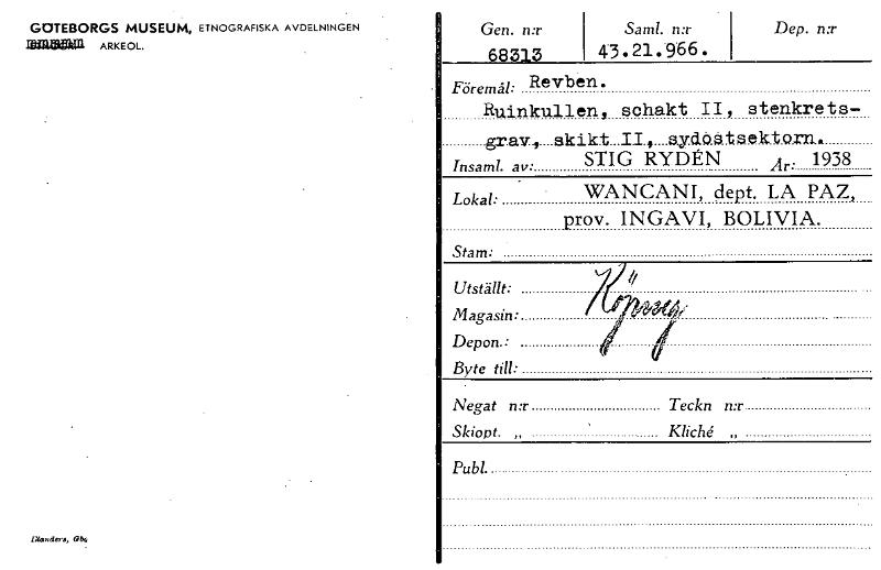 GOTEBORGS MUSEUM, ETNOGRAFISKA AVDELNINGEN "SM ARKEOL. 12andara, Gb Gen. n:r 68313 Sam!. n:r 43.21.-966. Dep. n:r Föremål: Revben. Ruinkullen, schakt II, stenkrets- gzav„ .skikt ..I.I.,. .s.ydö.atek.t.Q.rn.. Insaml. av: STIG RYD£N Ar: 1938 Lokal: • WANCANI, dept. LA PAZ, prov. INGAVI, BOLIVIA. Stam: Utställt: 4 Magasin: 4f Depon.: Byte till: Ålegat n:r Teckn n:r Skiopt. „ Kliché „ Publ. [ocr]