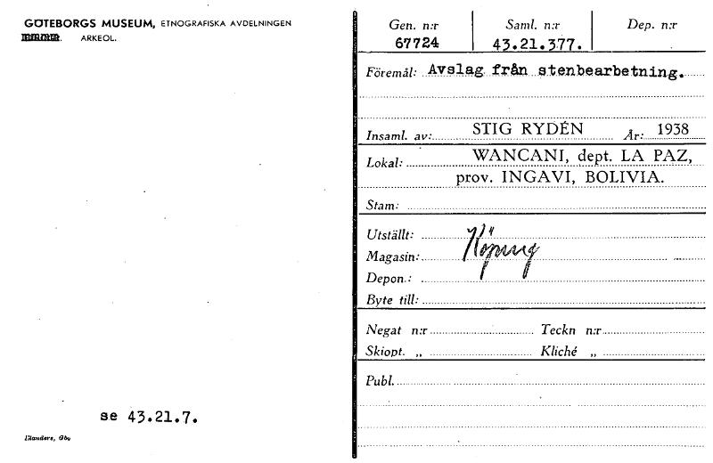 • Gen. n:r Sam!. n:r Dep. n:r 67724 43.21.377. Föremål: Avslag et från en i bearbetnng. GOTEBORGS MUSEUM, ETNOGRAFISKA AVDELNINGEN 1flffl23a. ARKEOL. STIG RYD£NÄr: 1938 Insaml. av- WANCANI, dept. LA P... Visa hela