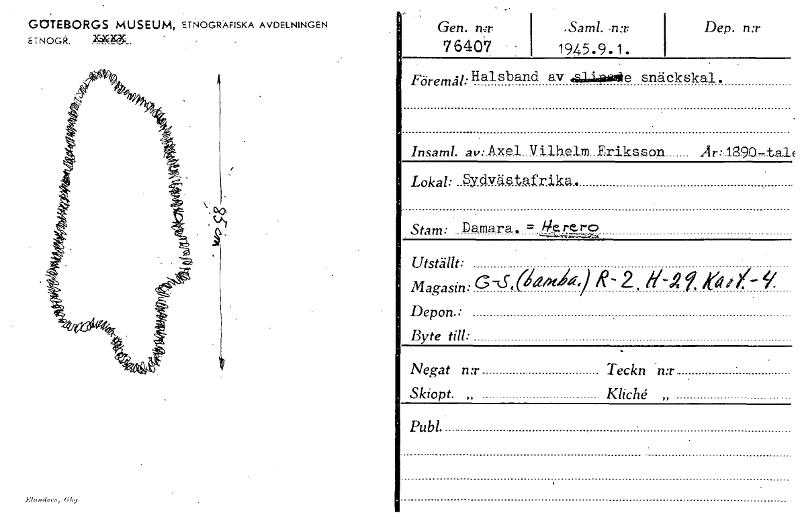 • GOTEBORGS MUSEUM, ETNOGRAFISKA AVDELNINGEN ETNOGIk. G by i Gen. NT . 76407 — ; .Saml. lm: 1945.9.1. Dep. n:r Föremål: isband av ‹.9.1.10aole snäckskal. insam/. av:Axel Vilhelm..Erikseon Är:,.1890 ta... Visa hela