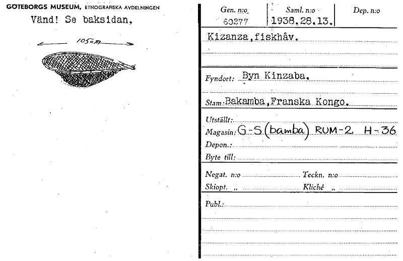 GOTEBORGS MUSEUM, ETNOGRAFISKA AVDELNINGEN Vänd! Se baksidan. Gen. n:o 63277 Samt, n:o Dep. n:o 1938.„28,13, Kizanza,fiskhåv. • Fyndort: Byn Kinzaba. stam .Bakamba Franska Kongo. Utställt • Magasin: ...