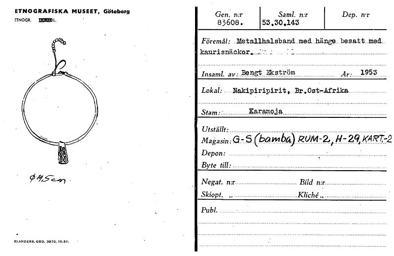 ETNOGRAFISKA MUSEET, Göteborg CTNOGR. finalen. Gen. n:r Saml. n:r Dep. nr 83608.. 53,30443 Föremål: MetaLlhalsband med hänge besatt med kaurisnäckor...:.- Insaml. av • Bengt Ekström Ar. 1953 Lokal: Nakipiripirit, Br.Ost-lfrika Stam:- Earamoja Utställt • Magasin: G-5 ba ba. ROM-21,14-29, KAR7-2 Depon: Byte till: Negat. n:r Bild n:r Skiopt. „ Kliché., Pub!. ELANDER5. GBG. 3870. 10.51. [ocr]