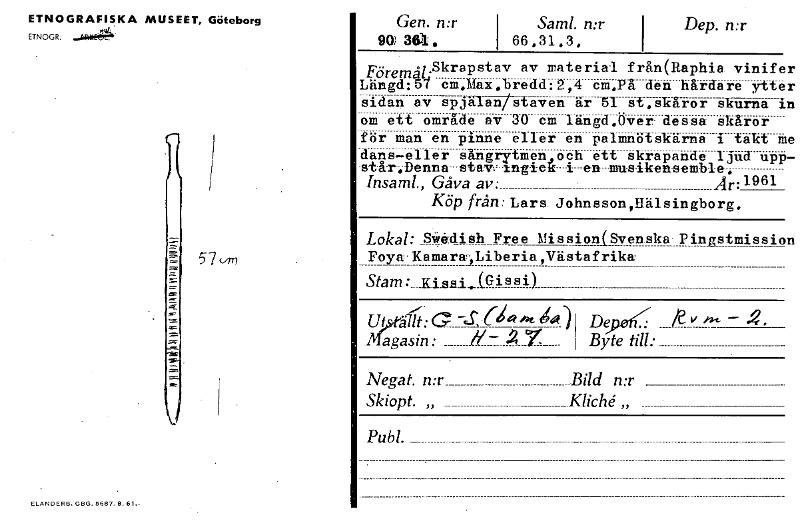 ETNOGRAFISKA MUSEET, Göteborg ETNOGR. Gen. n:r I Saml. n:r Dep. n:r 9a 361. 66,31.3, Föremål,Skrapstav av material från(Raphia vinifer Längd: 51 em.hiax.bredd:2,4 cm.13å den hårdare ytter sidan av spjälan/staven ar 51 st.skåror skurna in om ett område av 30 cm langd.Över dessa skåror för man en pinne eller en palmnötskärna i täkt me dans—eller sångrytmen .och ett skrapande ljud -upp- står.Denna stav, ingick i en musikensemble. Insaml., Gåva av: Är:-961 Köp från. Lars Johnsson,Hälsingborg. Lokal: swedish Free Ilission(Svenska Pingstmission Foya Kamarw,Liberia,Västafrika Stam: jetssiAGis si) Ut tällt: G Cla t4a agasin: 7 De v - Byte till: Negat. n:r _ Bild n:r Skiopt. „ Kliché,, Pub!. 57 ,4,9 ELANDERS. GBG. 5687. e. 61.. [ocr]