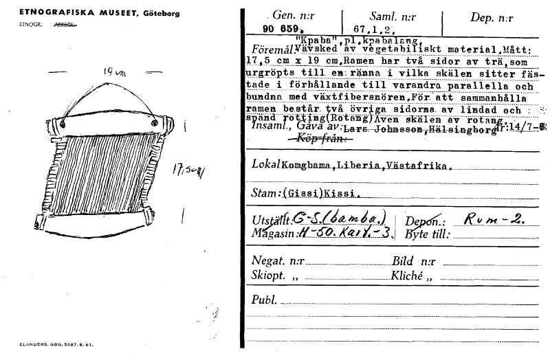 ETNOGRAFISKA MUSEET, Göteborg ETNOG R. „Ait-K-EAL-, 19 ,41\ ELANDEF25. GBG. 5687. B. 61. _ Gen. n:r 90. 659., Samt. n:r 1 67,1,2, i Dep. n:r Npaba",pl.kpabalangt Förenigylvsked av vegetabiliskt material,Mått: 17,5 cm x 19 cm,Ramen har två sidor av trä som urgröpts till en: ränna i vilka skälen sitter fäs. tade i förhållande till varandra parallella och bundna med växtfibersnären,För-att sammanhålla ramen består. två övriga sidorna, av lindad och ; pänd rotting(Rotang)Aven skälen av rotan, - i änsann., Gava av:Lars,__j_igan_s_s_on___Et 1_84,1¥:box :14/7.-1 9 --Kilp=f-r-M4— LokalKonghaina_,_Likeri Stam4Gissi)Kissi.,_ a --- ,Väs_t_afrik_a._ Uts " t:G-1.(14eAtifJ Magasin :41—(59. )(414-3,. De n.: yte till: Negat. n:r Bild n:r Skiopt. „ Kliché,, Publ. _ [ocr]