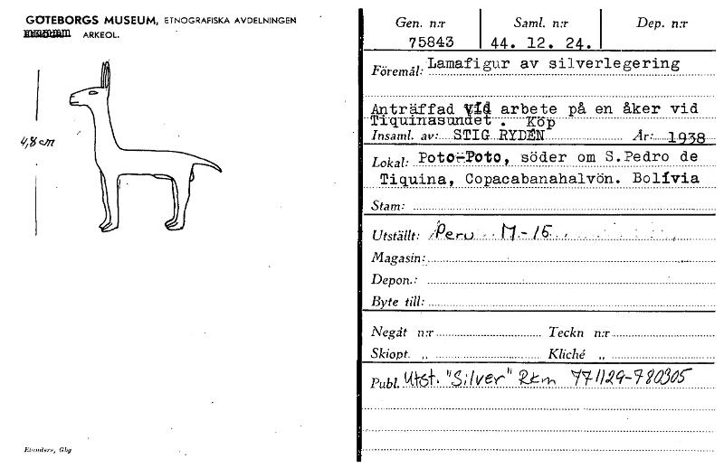 GOTEBORGS MUSEUM, ETNOGRAFISKA AVDELNINGEN ~11 ARKEOL. 4t,Yc/rt Ebenders,Gby Gen. n:r , 75843 Saml. n:r 44. 12. 24. Dep. n:r Föremål:Lamafi gur av silverlegering Anträffad V4 arbete på en åker vid -Tiquinasun et . ICUp Insaml. av: ..... STIG...RYD2N Ar: 1938- Lokal: PotoPoto, söder om S.Pedro de Tiquina, Copacabanahalvön. Bolivia Stam: ' Utställt: /Pe.ru ' ' ils i 6T. , • . .. ' • Magasin:, Depon.: Byte till: Negåt n:r Teckn n:r Skiopt. „ Kliché. „ Publ.(46-F, 963Veri' Zkvin 'Dg' /Mg- 7 Ojar , , [ocr]