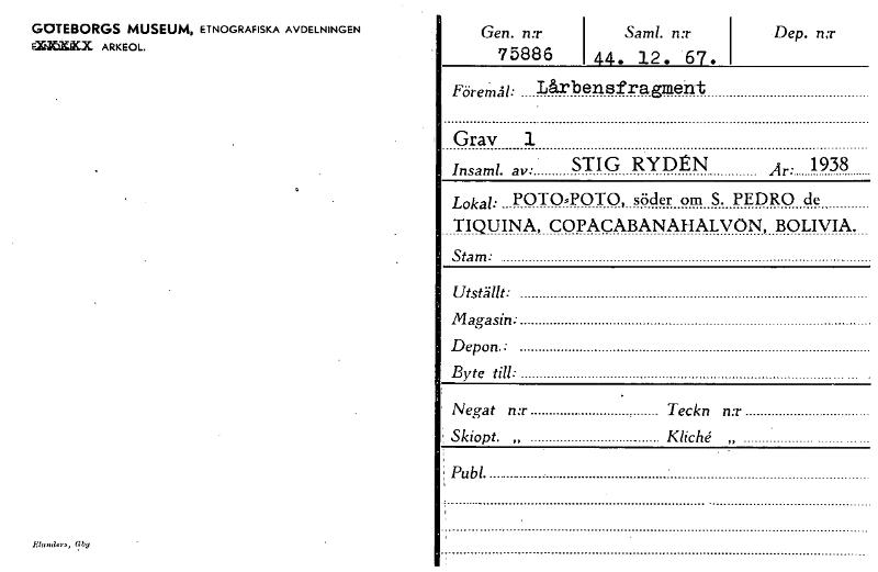 GOTEBORGS MUSEUM, ETNOGRAFISKA AVDELNINGEN åraÖXTX.X ARKEOL. Ehmaerå, 9by Gen. n:r 75886 Sam!. n:r i 44. 12. 67. Dep. n:r Föremål: Lårbensfragment Grav 1 Insaml. av • STIG RYDÉN Ar: 1938 Lokal: POTO.,POTO, söder om S. PEDRO de TIQUINA, COPACABANAHALVON, BOLIVIA. Stam: Utställt: Magasin: Depon.: Byte till: , ; Negat n:r • Teckn n:r Skiopt. „ Kliché „ Publ. , ; [ocr]