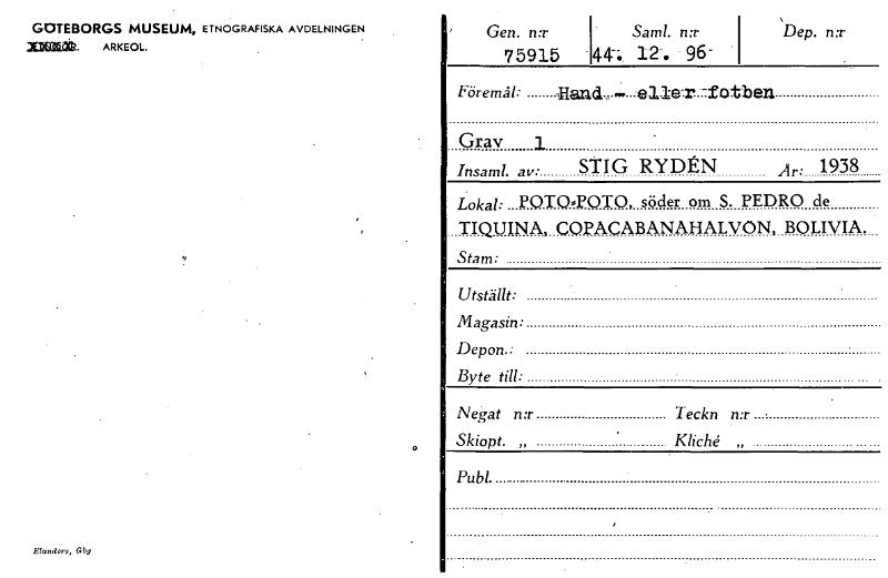 • GOTEBORGS MUSEUM, ETNOGRAFISKA AVDELNINGEN XIEOLIÅR. ARKEOL. Elanders, °by Gen. n:r 75915 -44:-: Sam!. n:r 12-. 96- . 'Dep. n:r Föremål: -Hand...-..elie-x -.fotben Grav 1 • Insaml. av: STIG RYDÉN ... Visa hela
