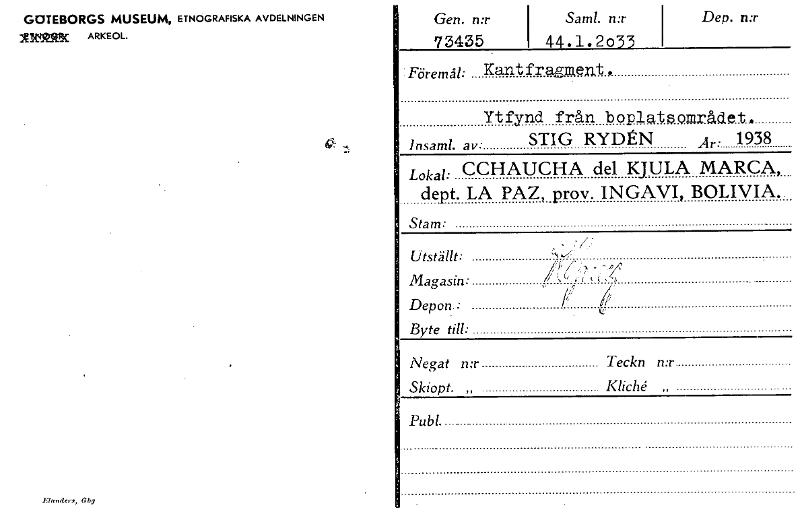 GOTEBORGS MUSEUM, ETNOGRAFISKA AVDELNINGEN Altvitatc ARKEOL. Ehenders, <ng Gen. n:r 73435 Sam!. n:r i 44.1.2o33 Dep. n:r - Föremål: Kantfragment, Ytfynd från boplatsområdet... Insaml. av: STIG RYDÉN Är. 1938 Lokal: CCHAUCHA del KJULA MARCA, dept. LA PAZ, prov. INGAVI, BOLIVIA. Stam: Utställt: Magasin: /Depon.: 1' Byte till: Negat n:r Teckn n:r Skiopt. „ Kliché „ Publ. [ocr]