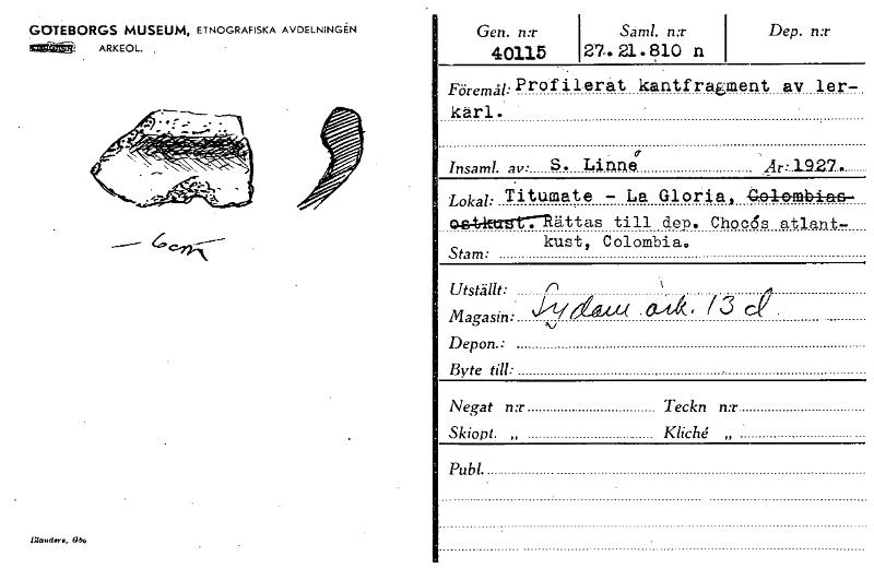 • GOTEBORGS MUSEUM, ETNOGRAFISKA AVDELNINGEN atiligaBl ARKEOL. Gen. n:r 40115 Saml. n:r 27. 21. 810 n Dep. n:r Elawiers,Gbo Föremål:Profilerat kantframent av ler- karl. Insaml. av: S. Linne Lokal: Tit... Visa hela