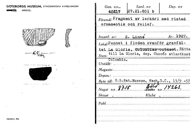 GOTEBORGS MUSEUM, ETNOGRAFISKA AVDELNINGEN 1191~ ARKEOL. Manders, Obu Gen. n:r..... 40217 Sam!. n:r 27,21.851 b Dep. n:r Föremg:Fragment av lerkärl med ristad ornamentik och relief'. hisam/. av: S.,... Linne' År 1927. Lokal:Fuhnet i floden ovanför gravfäl- ..tet..1a...Q1o.ria., Co71-outters-vs-bigtget . Rätta Stam: till La Gloria, dep. Choc6s atlantkust Colombia. Utställt: Magasin: Depon.: Byte till: il.S.Nat.Museum, Wash .D. C . 13/9 -5.7 Negat n:r. .P' n:r /Y163. Skiopt. „ Kliché Publ. • [ocr]