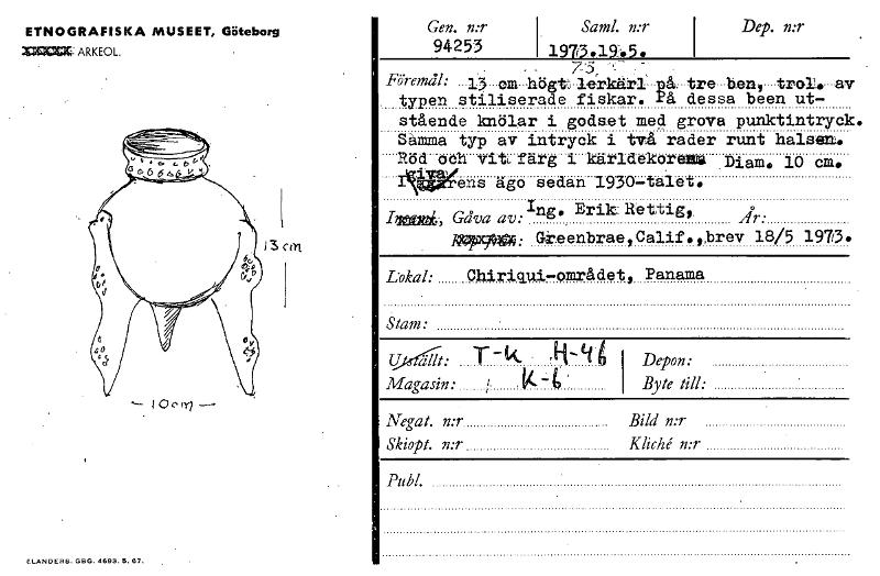 ETNOGRAFISKA MUSEET, Göteborg XMOMV ARKEOL. 94253 I Saml. n:r mr Gm n:r 1973.19.5. Föremåh73, •-- - 13 em- högt: lerk.ärl å tre ben, tror. av typen stiliserade fiskar. På dessa been ut- stående knölar i godset med grava punktintryck. Samma typ av intryck i två rader runt halsen. Röd och vii färg i kärldekorel¥ Diam, 10 cm. 104ens ägo sedan 1950-talet. I2g1i, Gåva av: Ing. Erik, Rettig A AUP9hU: 0teenbrae Calif.9brev 18/5 1973. Lokal: Chiriqui-området9 Panama Stam: Uysfgt: T —k • fi-4.4 I Depon: Magasin: I Byte till: 13 ML I, c fy Negat. n:r Bild n:r Skiopt. n:r Kliché n:r Pub!. E.LANDERS, GBG. 4693. 5.67. [ocr]
