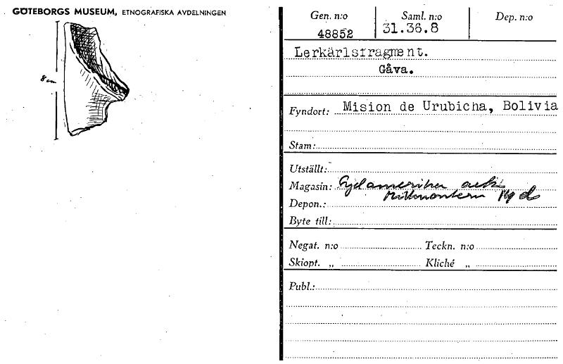 GOTEBORGS MUSEUM, ETNOGRAFISKA AVDELNINGEN Gen. n:o Saml. n:o Dep. n:o 48852 31' 3°88 Le rkär srragnB n t. Gåva. Fyndort: Mision de Urubic ha, Boliv ia Stam. Utställt. Magasin • 0.4.444, • /.1441-4,...