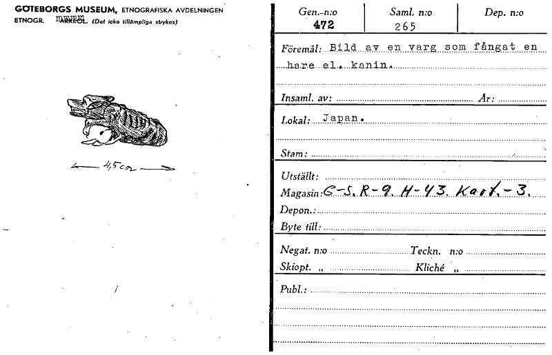 • GOTEBORGS MUSEUM, ETNOGRAFISKA AVDELNINGEN' ETNOGR. 11142-81. (Det icke tillämpliga strykes) Gen.-n:o 472 Sam!, mo 265 Dep. mo Föremål: Bild av en varg som fångat en Insaml. av: År: Lokal: Japan. ... Visa hela