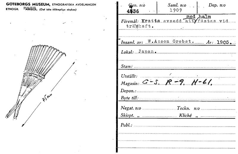 • Dep. mo GOTEBORGS MUSEUM, ETNOGRAFISKA AVDELNINGEN ETNOGR. mana. (Det Icke tillämpliga strykes) 4en. n:o 036 Saml. n:o . 1909 med. halm Föremål: ..Mittä.....a.v.s.e.d.d....att. vid träleaft. Insaml. a... Visa hela