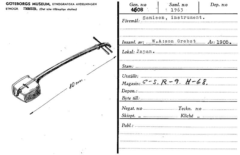 • Dep. n:o GOTEBORGS MUSEUM, ETNOGRAFISKA AVDELNINGEN ETNOGR. mana. (Det Icke tillämpliga strykes) Sam!. n:o t 1963 • Gen. n:o 4608 Samisen, instrument. Föremål: Insaml. av: W.A:son Grebst År: 1905 .... Visa hela