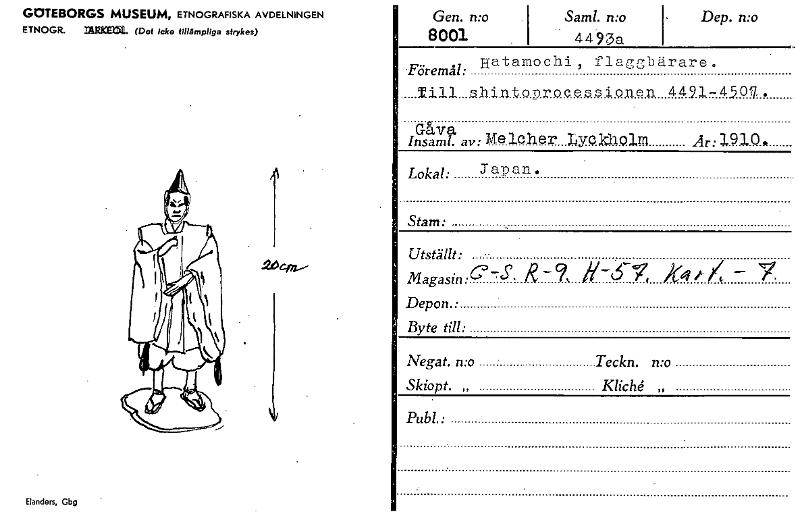 • GOTEBORGS MUSEUM, ETNOGRAFISKA AVDELNINGEN ETNOGR. DiRraa. (Det Icke tillämpliga strykas) Zocan.-- Elanders, Gbg Gen. n:o 8001 Sam!. n:o 4493a i. Dep. n:o Hatamochi, flagg-bärare. 'Föremål: Till ..sh.... Visa hela