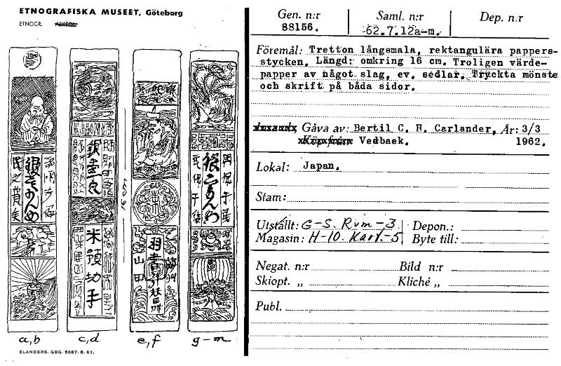 Publ. Gen. n:r 88156. i Saml. n:r Dep. n:r I . I Föremål: Tretton långsmala, rektangulära pappers- stycken, Längd:- omkring 16 cm. Troligen värde- papper av något, slag, ev. sedlat.,itckte mönste och skrift på båda sidor. 26axartrig Gåva av: Bertil Q. B. Carlander, Ar: 3/3 xbatipx~ Vedbaek. 1962. Lokal: Japan. Stam: _ • Ut ållt: 6_74_, R. ; Depon.: agasin: led /1.--s- Byte till: Negat. n:r Bild n:r Skiopt. „ Kliché,, yr,~3A -:J a-,b ELANDERS. GEIG. 5687. 8. 61. _ ETNOGRAFISKA MUSEET, Göteborg ETNOGR. AR:~ [ocr]