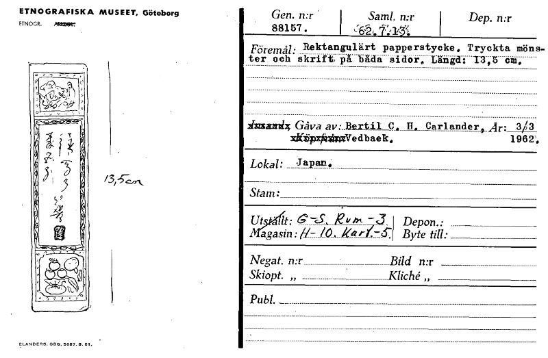 ETNOGRAFISKA MUSEET, Göteborg ETNOG R. firber~ ELANDERS, GBG. 5687. 8.6!. Gen. n:r ' 88157. I Sam!. n:r I L6-‘1.114: i Dep. n:r Föremål: Rektangulärt papperstycke. ter och skrift på båda sidor. Längd: 2haunnin Gåva av: Bertil C. H, Carlandero_ xiagg.~Vedbaek. Tryckta mönE 13-,5 cm. Är: 3/3 1962', Lokal: Japan. Stam: • Ut • lt:6' ---.S___,_ g v m- -J. Magasin: 61- /0_, karK-67. Depon.: Byte till: Negat. n:r_ Bild n:r Skiopt. „ _ Kliché,, Publ. [ocr]