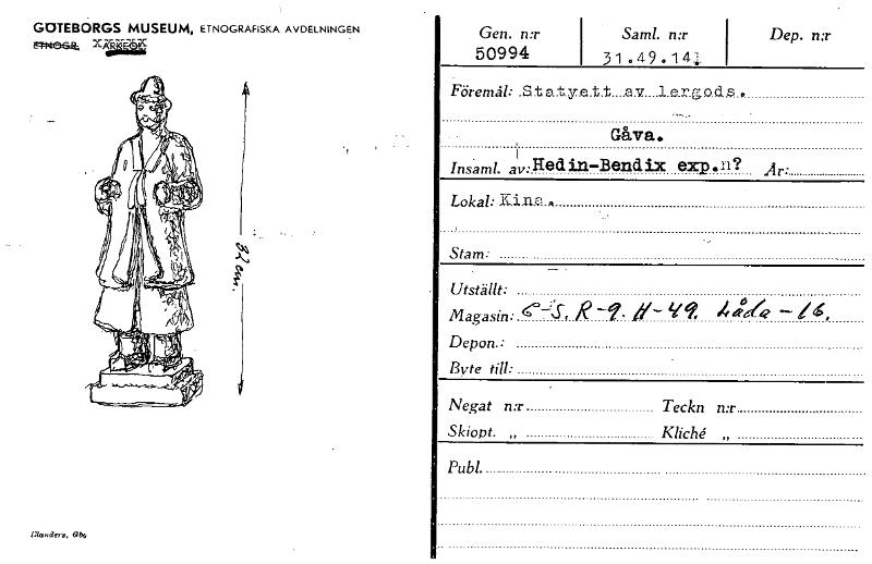 • GOTEBORGS MUSEUM, ETNOGRAFISKA AVDELNINGEN 2444e6Th Xjääkä Gen. n:r 50994 iSaml. n:r 31 .49.14; Dep. n:r Föremål: .Staty.e.t.t. lergo.cts Gåva. Insaml. av.Hed in—Bendix exp . n ? Är' Lokal: K i XI .?... Visa hela