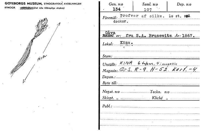 • GOTEBORGS MUSEUM, ETNOGRAFISKA' AVDELNINGEN ETNOGR. nteeLja(Det icke tillämpliga strykes) Gen. n:o Saml. n:o 154 * 107 Dep. mo p Föremål: rofver af silke. lo st. så dockor luegZav: f_ru S. Brasewitz ... Visa hela