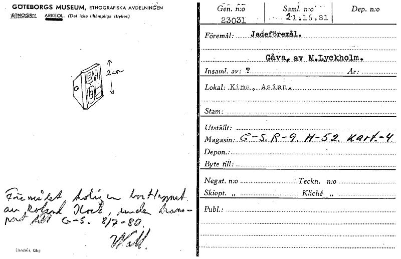 GOTEBORGS MUSEUM, ETNOGRAFISKA AVDELNINdEN leigg.-tt-11- ARKEOL. (Det icke tillämpliga strykas) „ 4." CIAs- .12A 124 C e)2 te?, Elandd,s, Cbg 7K, - - — Gen. n:o 23031 . Saml. mo' ' ' .. - . 2.1.16.81 Dep. mo Föremål: Jadefötemål. ._ .. Gåva,, av M.L.yekholm. Insaml. av: ? År: Lokal: .Kina..,...A.s.i.e.ri.. Stam: Utställt: Magasin: S. if —9. if-5-2, ire? .,— Depon.• Byte till: Negat. mo • Teckn. n:o Skiopt. „ Kliché „ Pub!.: [ocr]