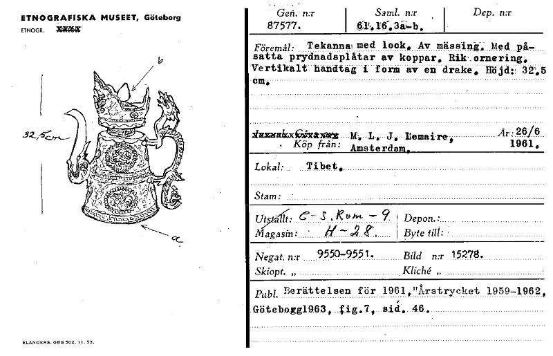 ETNOGRAFISKA MUSEET, Göteborg ETNOGR. kRICE7411C. Gen.- n:r I Sam]. mr , i Dep. n:r 87577. Föremål. Tekanna f med lock. Av mässing. Med på- satta Prydnadsplåtar av koppar. Rik ornering. Vertikalt handtag i form av en drake. nöjd:. 345 em. ixmarmkxeximme* M. L. J. Lemaire. , Köp från: Amsterdam. Lokal: Tibet. Stam: Ut 9550-9551. Bild rix 15278. Kliché Pub!. Berättelsen för 1961,"Årstryeket 1959-1962, Götebogg1963 fig.7 sid. 46. Är: 26/6 1961. Magasin: il- .2 e iVegat. n:r Skiopt. „ Depon.: Byte till: ELANDERS. GEIG 502. 1 I. 53. [ocr]Stäng