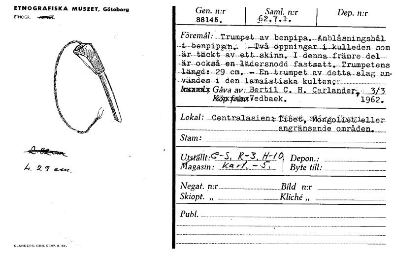 ETNOGRAFISKA MUSEET, Göteborg ETNOGR. ~FM Gen. n:r I Sam!. n:r 88145. I , Dep. n:r Föremål: Trumpet...av__Ienpipa._-__Anblåsningshål. ..4 inpip;"---TArå äpp_ningar _i -.k-ulleden sam --är täckt -a-v- -e-t-t- -skinn._ denna__..främre-de-1---- ---är---ack-så---e-n---lä-dersnadd___f_astsatt Txumpet_ens — En ---- Inszurrt4 Gåva av: Bertil Carlande4,.; 3/3 Igöpc~Vedbaek. 1962. Lokal: __Gent_ralasien fri h-et, efidlii-o-11-6-tieligr_ angränsande områd_en.____ Stam: ut ant:e-S, 16/ 0 Depon.: agasin: k4 ',57 Byte Negat. n:r Bild n:r Skiopt. „ Kliché,, Pub!. ELANDERS. GBG. 5607.8.61. " [ocr]