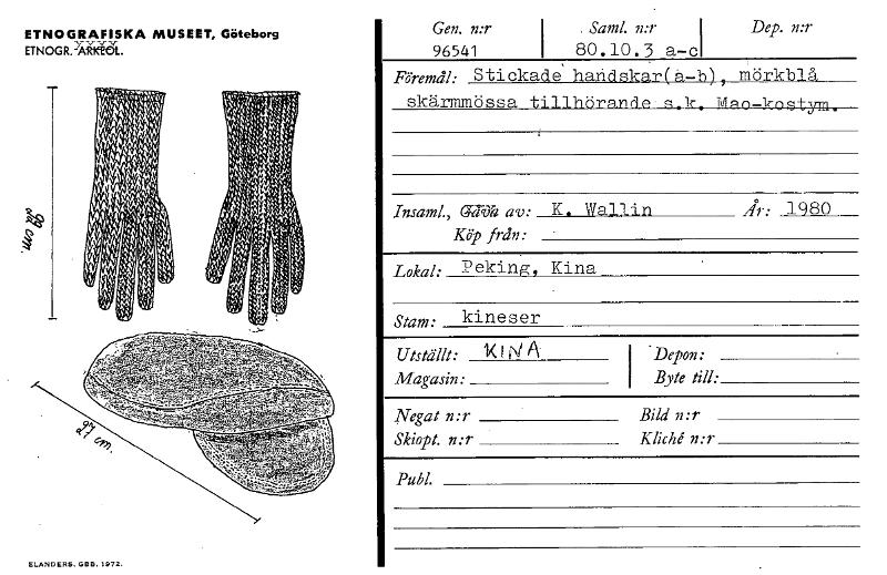 ETNOGRAFISKA MUSEET, Göteborg ETNOG R. 1/4 ELANDERS.G0111.1972. Gen. n:r I 96541 . Saml. n:r I 80.10.3 a—ci Dep. n:r Föremål- Stickade haridskar(å—b) , mörkblå a —D- skärmmössa I • . "• 1 . , Insarnl., (Wik av • K. Wallin 2,-• 1980 Köp från- Lokal: Peking, Kina Stam: kineser Utställt: 1‹ t NI A I "Depon: Magasin: I Byte till: Negat n:r Bild n:r Skiopt. n:r Kliché n•r Publ. [ocr]