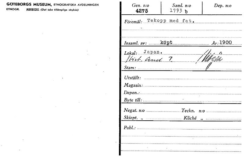 • GOTEBORGS MUSEUM, ETNOGRAFISKA AVDELNINGEN ETNOGR. 251MQ111 (Det icke tillämpliga strykas) Gen. n:o 4275 Saml. n:o 1793 b Dep. mo Föremål: Tekopp med fat. Insaml. av: köpt Är: 19 00 Lokal: Japan. /... Visa hela
