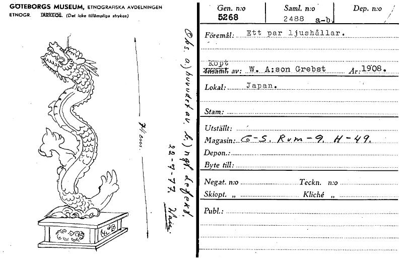 • Föremål: Ett par ljushållare Japan. Lokal: GOTEBORGS MUSEUM, ETNOGRAFISKA AVDELNINGEN ETNOGR. DWPM2. (Det icke tillämpliga sfrykes) Gen. n:o Sam!. n:o Dep. n:o 5268 2488 a—b. W. A:son Grebst Ar:19.08... Visa hela