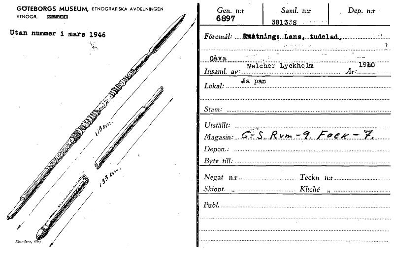 Gen. n:r 6897 Saml. n:r 38133s i . Dep. na• Föremål: .....RitiEtningt...Lans,...tudalad„ . ' ' .._.. , , .• . _, - . Gåva Me lche r Lyckho lm 1.910 Insaml. av: År• _. ) Ja pan Lokal: Stam: . ', Utst...